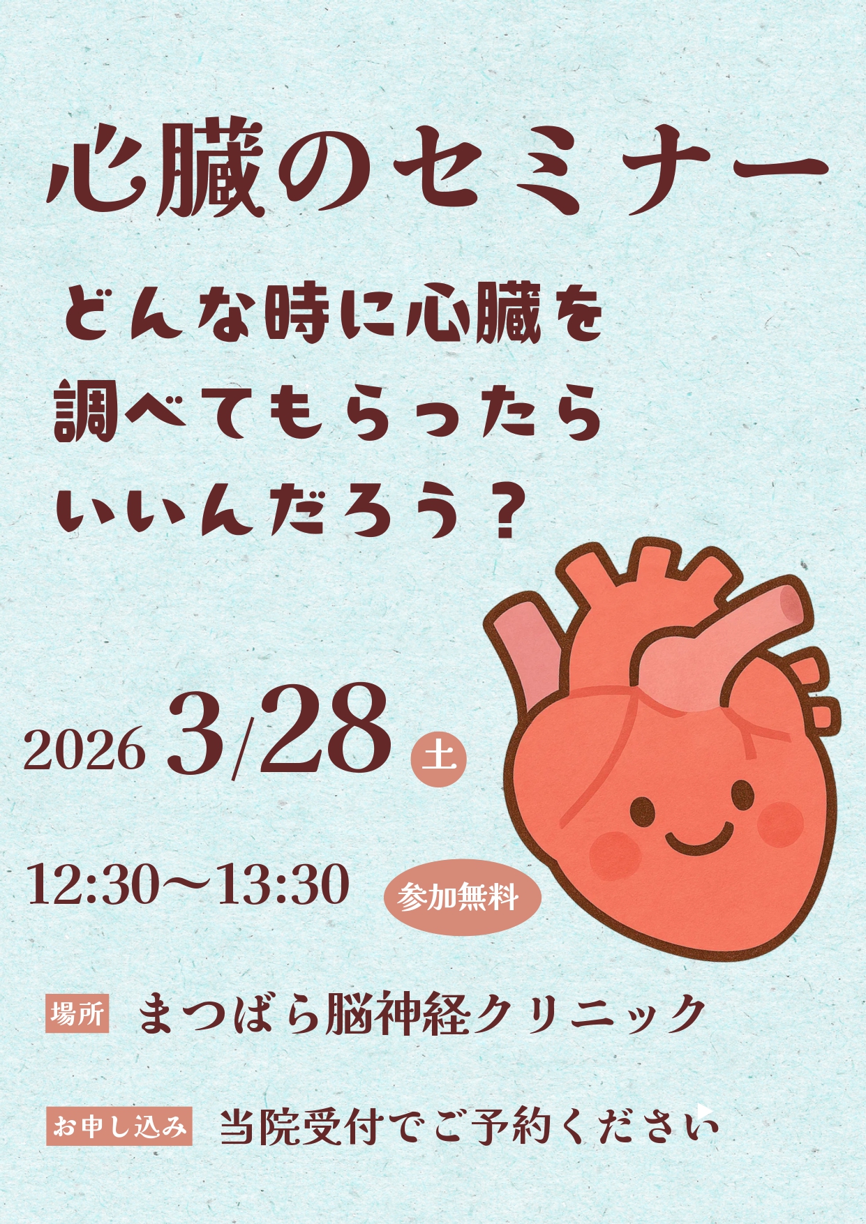 当院は脳神経外科を中心に診療を行っておりますが、心臓の健康管理にも力を入れております。心エコー検査をはじめとする各種心臓検査を院内で実施できる体制を整えており、動悸や胸の違和感、不整脈が気になる方も安心してご相談いただけます。