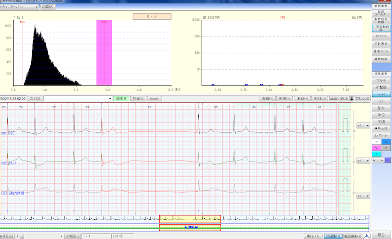 不整脈には脈が速くなったり、脈が飛んだり、不整脈が日に何回も出たりするものがあります。 このような不整脈は自覚することが多く、心電図で発見しやすいのですが大概は命の危険性が少ない不整脈です。世間一般の不整脈はこれに該当します。 しかし、本当に危険な不整脈は実は脈が極端に遅かったり、不整脈の自覚と直接関係なく気を失いそうになったり失神するような特徴があります。それでいて不整脈がたまにしか出現しない事もあり、1回の心電図では発見できないことが多いです。 その場合は、丸一日心電図を記録する24時間心電図が必要となります。 脳梗塞の原因となる心房細動という不整脈もこの24時間心電図で初めて発見される場合があります。 長時間記録するこの検査は不整脈の頻度、種類の特定、不整脈の検出率を向上など、より詳しく調べることができます。 24時間心電図は、以前は長く太い配線を何本も体に直に装着して昔懐かしい携帯オーディオプレイヤーのような思い本体をベルトに巻くという結構大掛かりな検査でした。 しかし、ここ10年で小型化が進んで現在では絆創膏のような薄い配線にUSBサイズ程の非常に軽い本体を装着して検査するので、負担の少ない検査になっています。