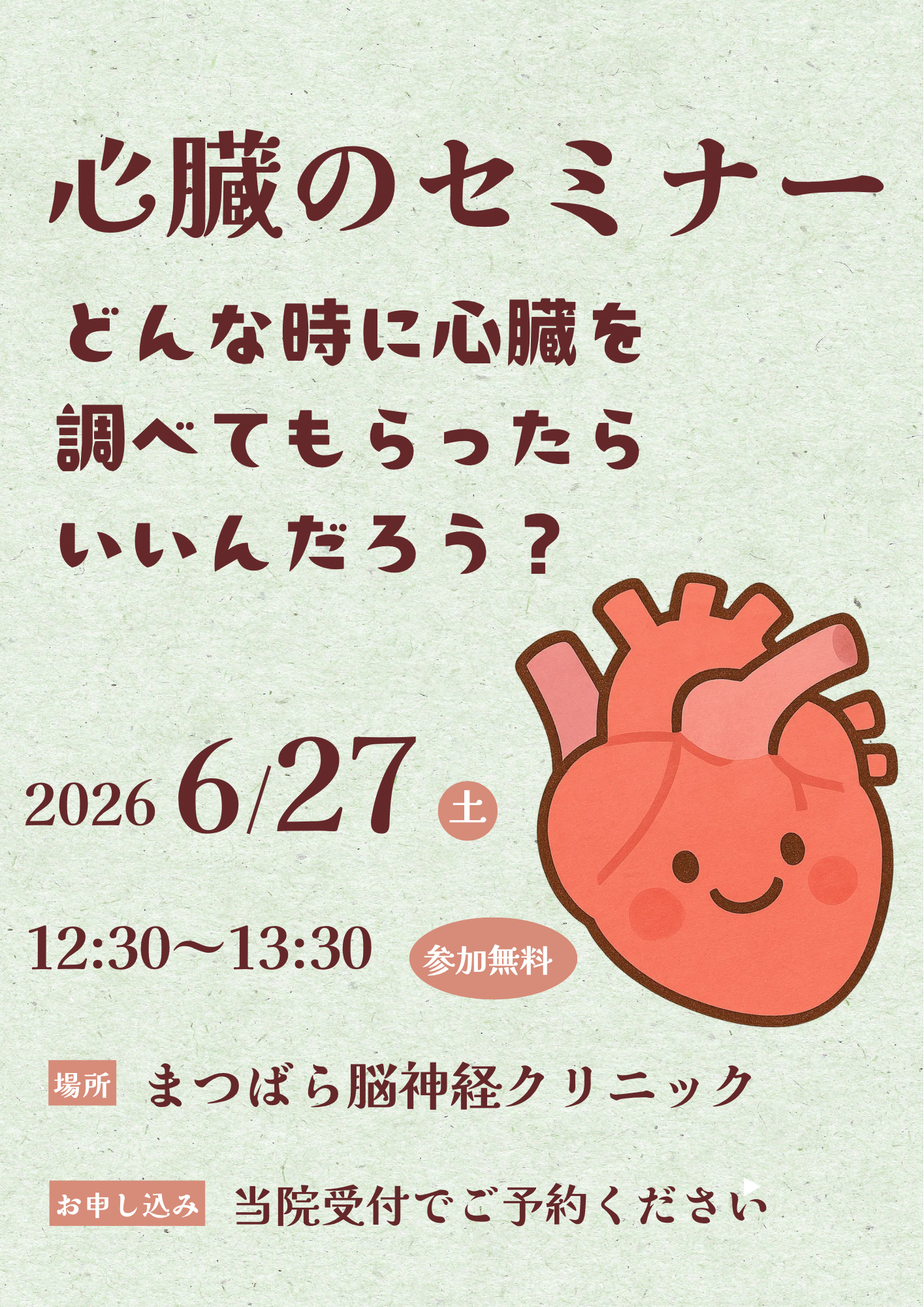 当院は脳神経外科を中心に診療を行っておりますが、心臓の健康管理にも力を入れております。心エコー検査をはじめとする各種心臓検査を院内で実施できる体制を整えており、動悸や胸の違和感、不整脈が気になる方も安心してご相談いただけます。
